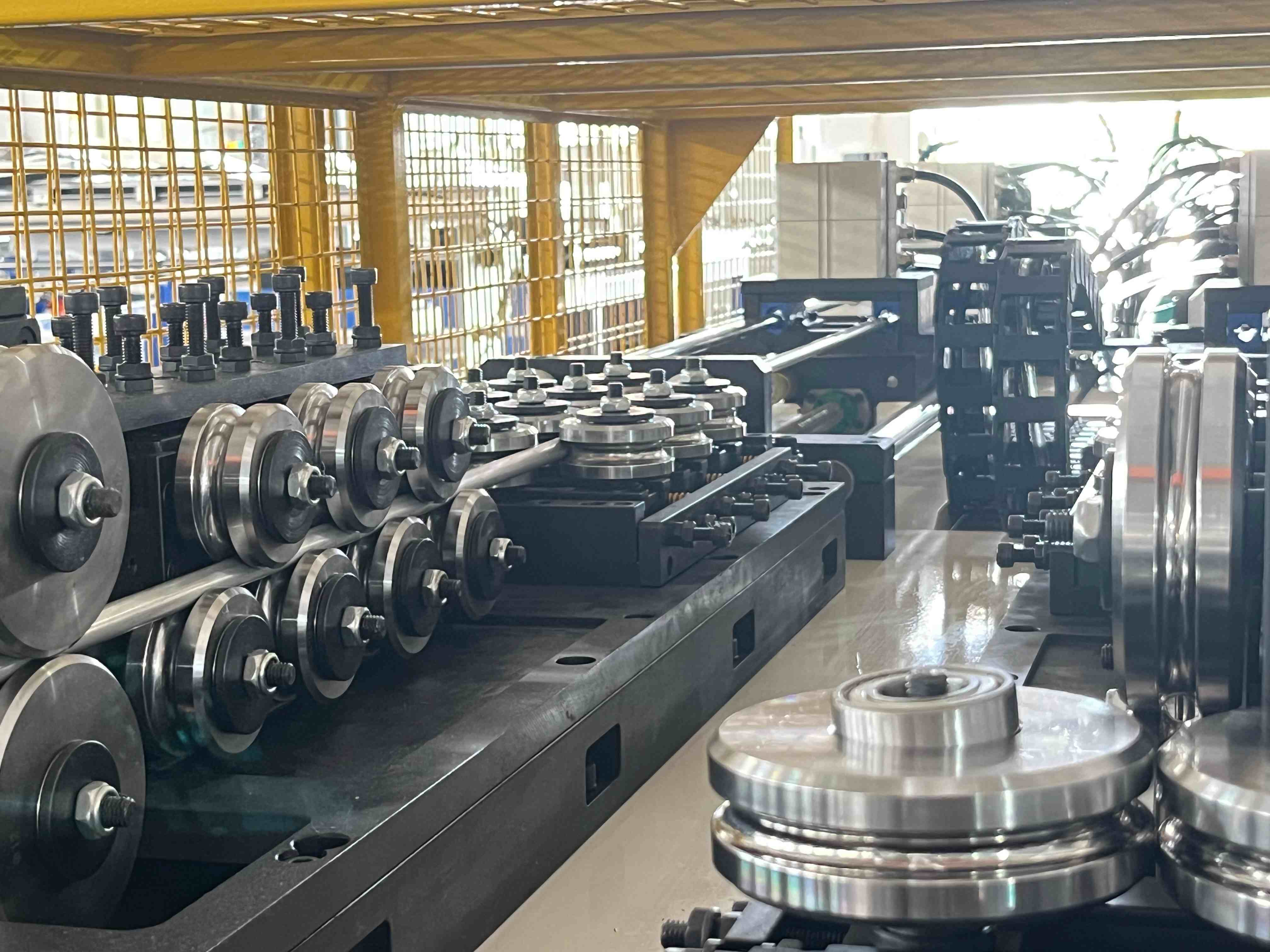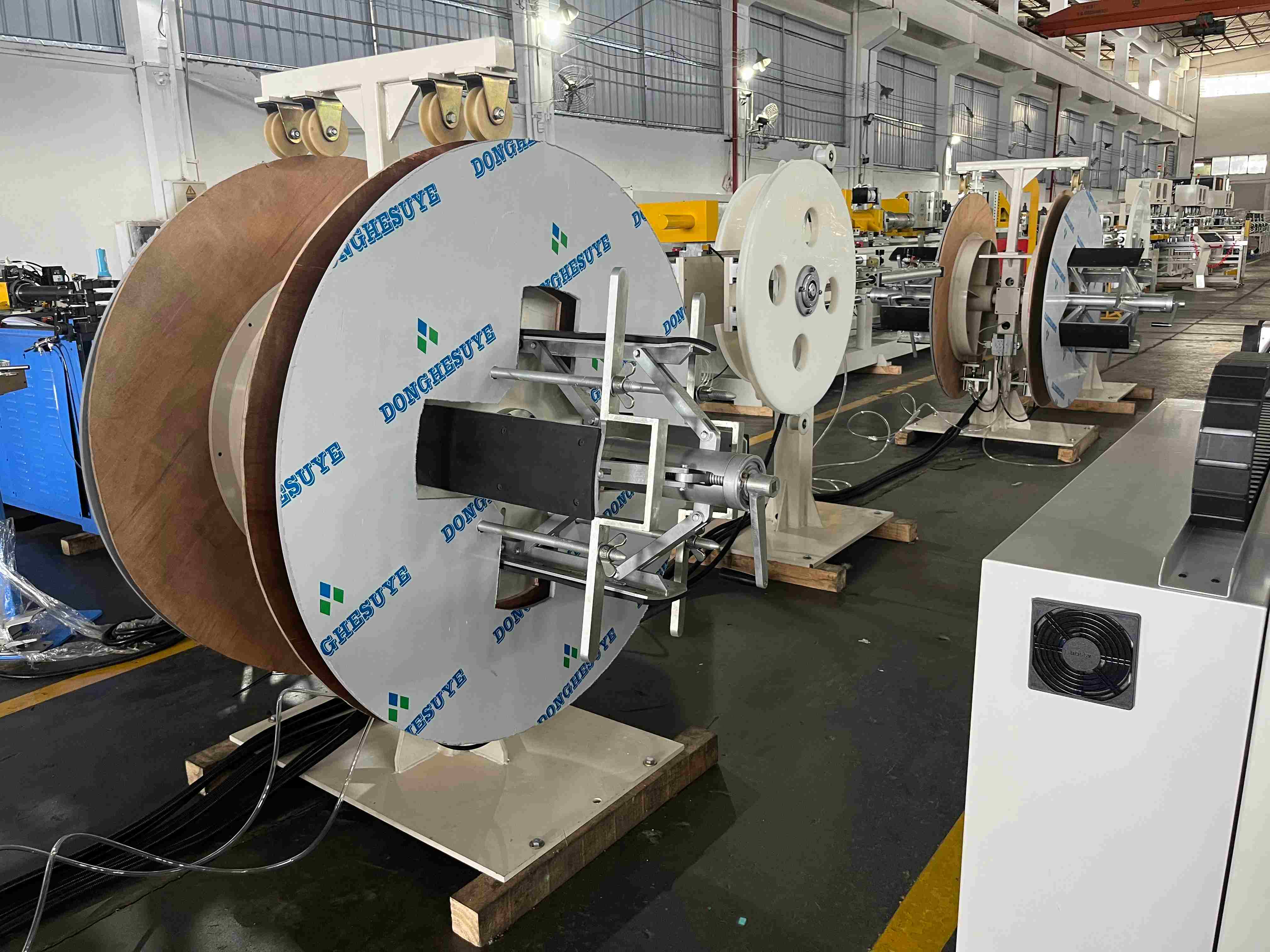 本机可将 4 卷盘料管子,经主动或被动放料、校圆、校直、定长送料、无屑切割、切割预拉、最终拉断、集料等工序,完成除人工装盘和人工引料之外的定尺开料工作。