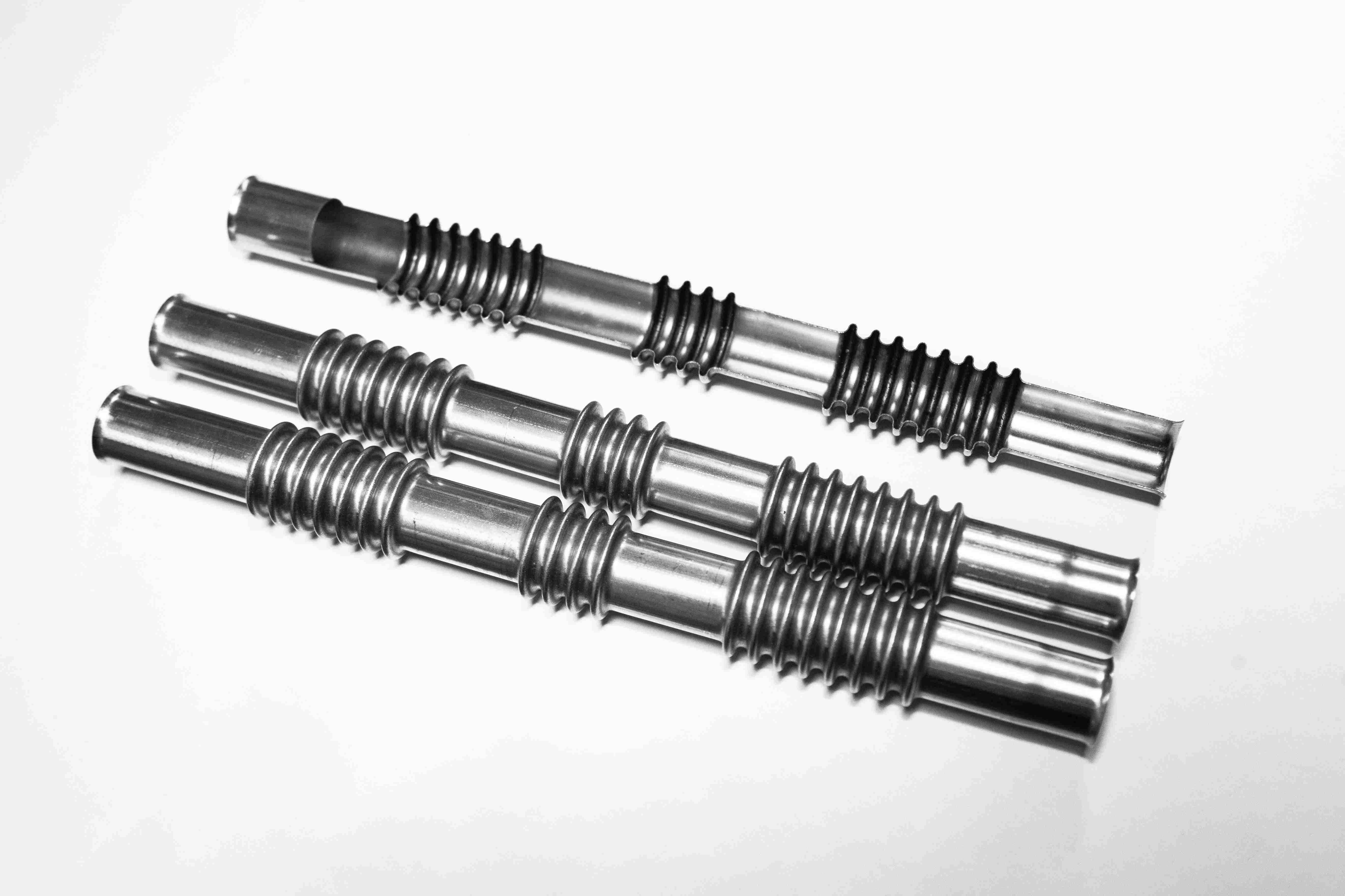 该设备的工作原理是将管件放置在单独的模具上,利用油缸驱动接头锁紧模具,利用高压水将管件分段胀大(胀形),再利用伺服驱动丝杠推动模具闭合形成波纹管(推波)。