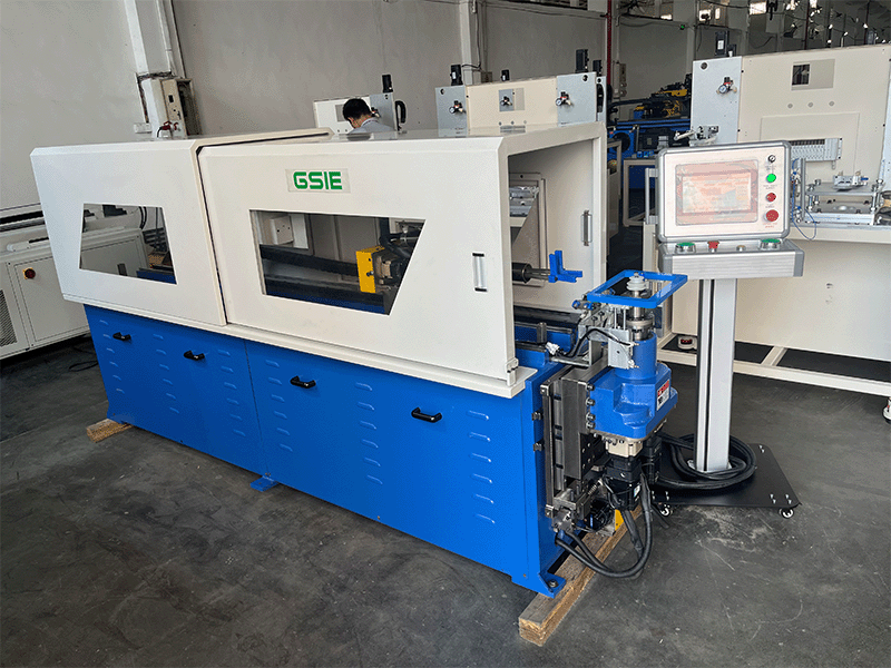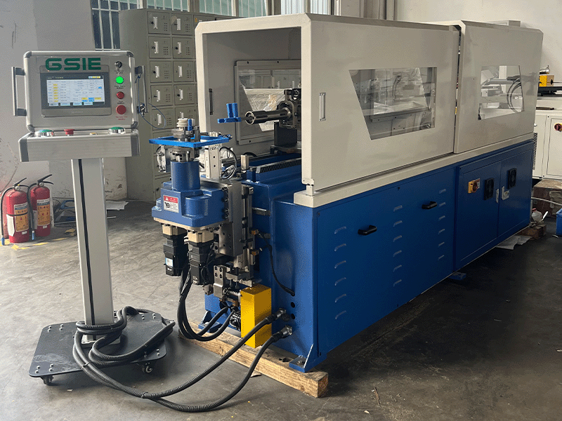 WXJ系列数控线材折弯机是针对实心线材折弯而设计的专用加工设备,可折弯φ4至φ12(铜、铝)的线材。该机线材夹紧机构采用气动控制,Y、B、C坐标系。机头升降、横向移动、轮模旋转、杠杆旋转均采用伺服驱动。整机控制采用微机控制,可实现四轴同步运动、主动折弯、被动折弯等复杂功能。